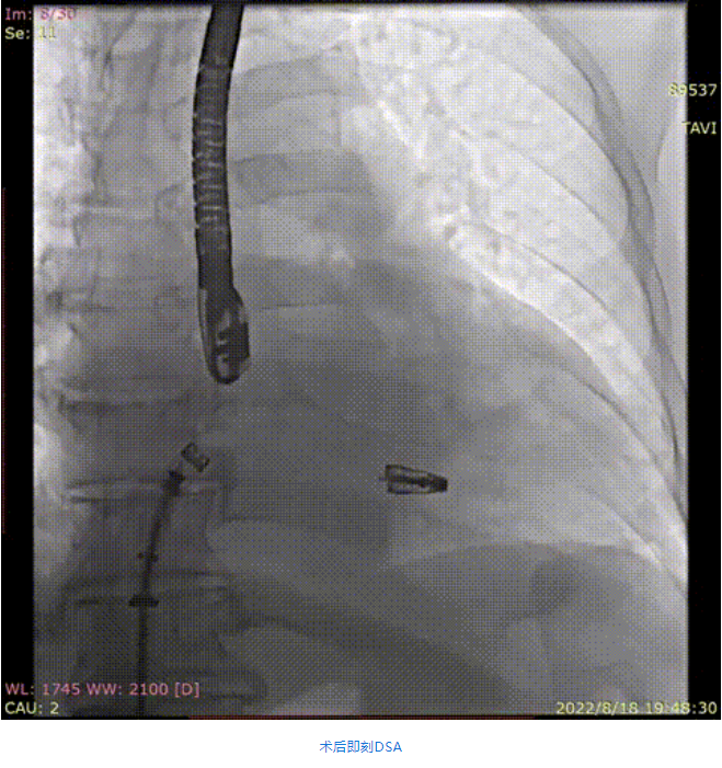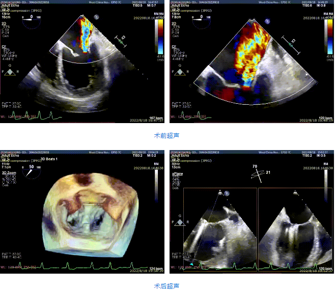 手術采用全身麻醉插管,經(jīng)股靜脈-房間隔入路,在TEE和DSA引導下完成房間隔穿刺。置入瓣膜夾系統(tǒng)后,在左房調(diào)整瓣膜夾的位置和軸向,后進入左室,在TEE引導下捕捉二尖瓣前后瓣葉,并關閉瓣膜夾。經(jīng)TEE反復確認手術效果后最終鎖定并釋放瓣膜夾。術后即刻超聲顯示瓣膜夾位置穩(wěn)定,功能良好,肺靜脈逆流和左房壓都明顯好轉。