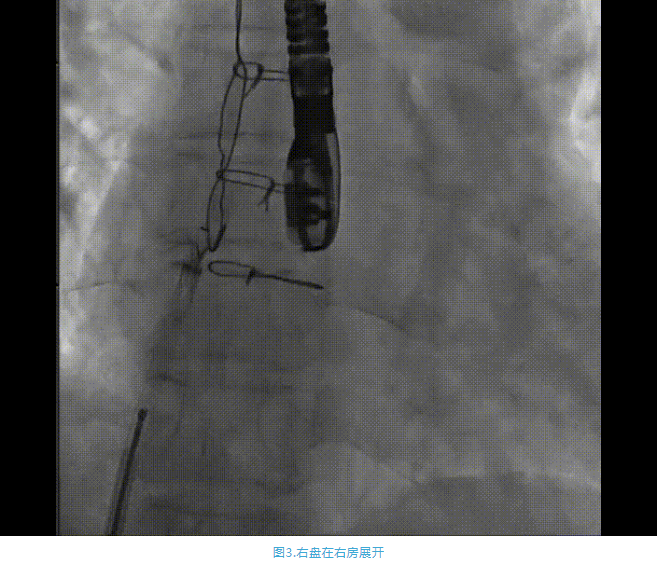 術(shù)中首先在局麻下穿刺股動(dòng)脈、股靜脈,完成心導(dǎo)管檢查評(píng)估后轉(zhuǎn)為全麻,在食道超聲引導(dǎo)下穿刺房間隔,穿刺成功后將加硬導(dǎo)絲送入左上肺靜脈建立軌道,根據(jù)患者病情行球囊預(yù)擴(kuò)張后植入6mm孔徑房間隔造孔支架,經(jīng)透視及食道超聲評(píng)估支架左右盤展開良好,夾持于房間隔兩側(cè),固定穩(wěn)定、位置良好,食道彩超顯示房水平右向左為主分流,分流孔直徑符合預(yù)期大小,心導(dǎo)管檢查評(píng)估達(dá)到預(yù)期效果,釋放造孔支架。術(shù)后12h患者下床活動(dòng),恢復(fù)順利,擬于近日完善術(shù)后評(píng)估后出院。