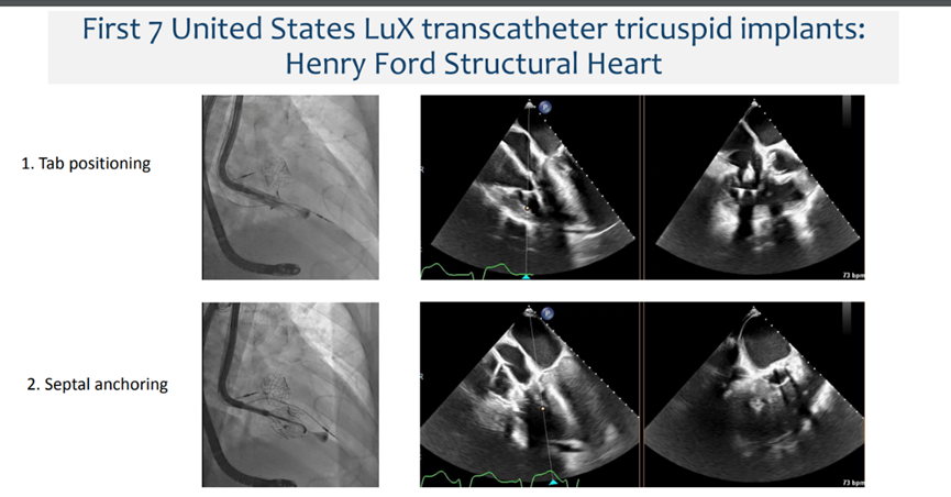 Dee Dee Wang教授隨后分享了Henry Ford Hospital前7例LuX-Valve Plus的植入經驗,并提示術中確定瓣葉夾持鍵的位置處于三尖瓣瓣環下方(右心室側),以及室間隔固定片與室間隔的相對位置關系是最關鍵的兩個步驟。通過經胃底短軸切面,配合右室流入/流出道切面的X-plane就能較容易地獲取相關影像。由于LuX-Valve Plus對超聲影像的要求較低,手術過程簡單易操作。