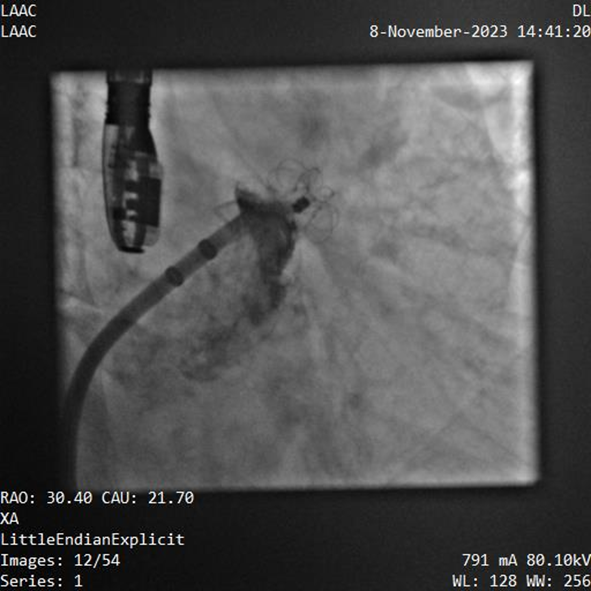 該例患者為男性58歲,陣發(fā)性房顫,9個月前突發(fā)急性腦梗死,3月前曾行房顫射頻消融術。2023年11月經(jīng)胸超聲心動圖示左房內(nèi)徑46mm,經(jīng)食道超聲心動圖示左心房及左心耳內(nèi)未見血栓形成,CHA2DS2-VASc評分3分,HAS-BLED評分2分。DSA測得左心耳開口直徑約23mm,錨定區(qū)域約18mm。