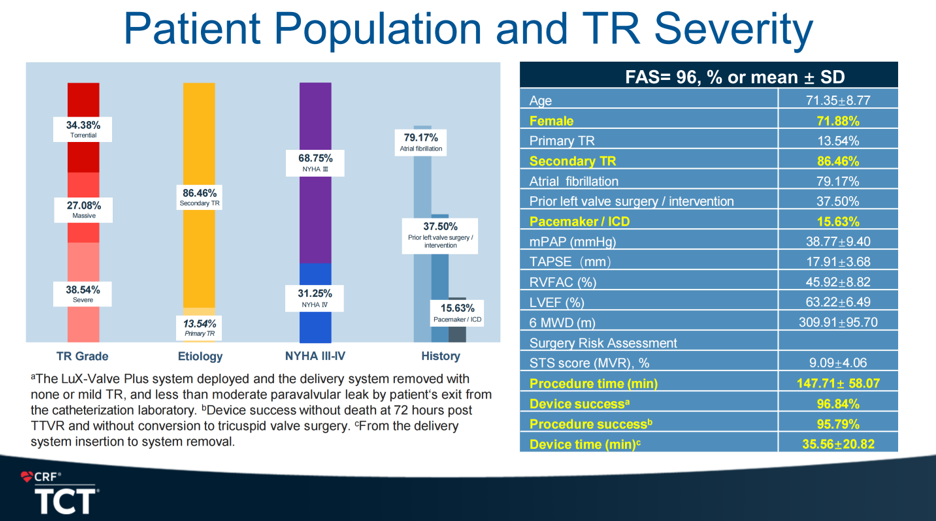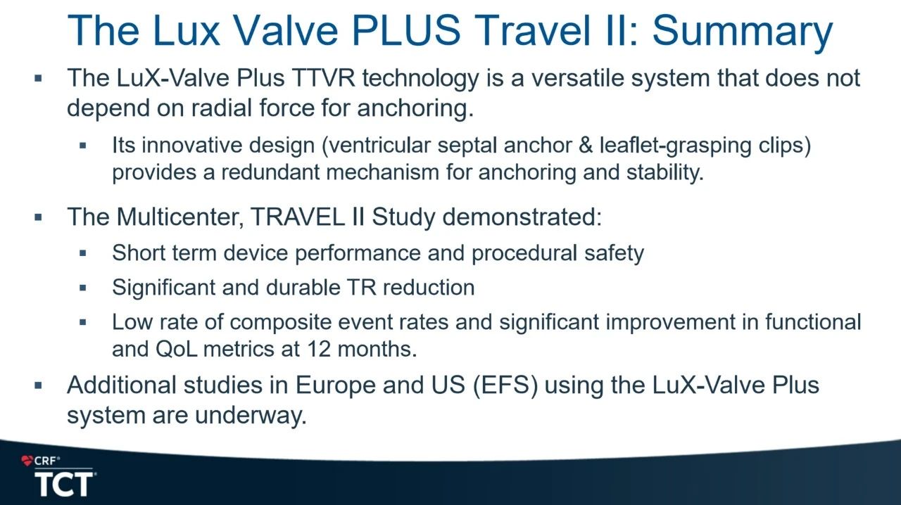 10月29日,本次 TCT 2024 會議的結(jié)構(gòu)心日程中,來自美國心血管研究基金會(Cardiovascular Research Foundation, New York, U.S.)的Juan F. Granada教授攜手中山醫(yī)院葛均波院士團(tuán)隊(duì)一同正式公布了 LuX-Valve Plus TRAVEL II 確證性臨床研究的1年期試驗(yàn)結(jié)果。