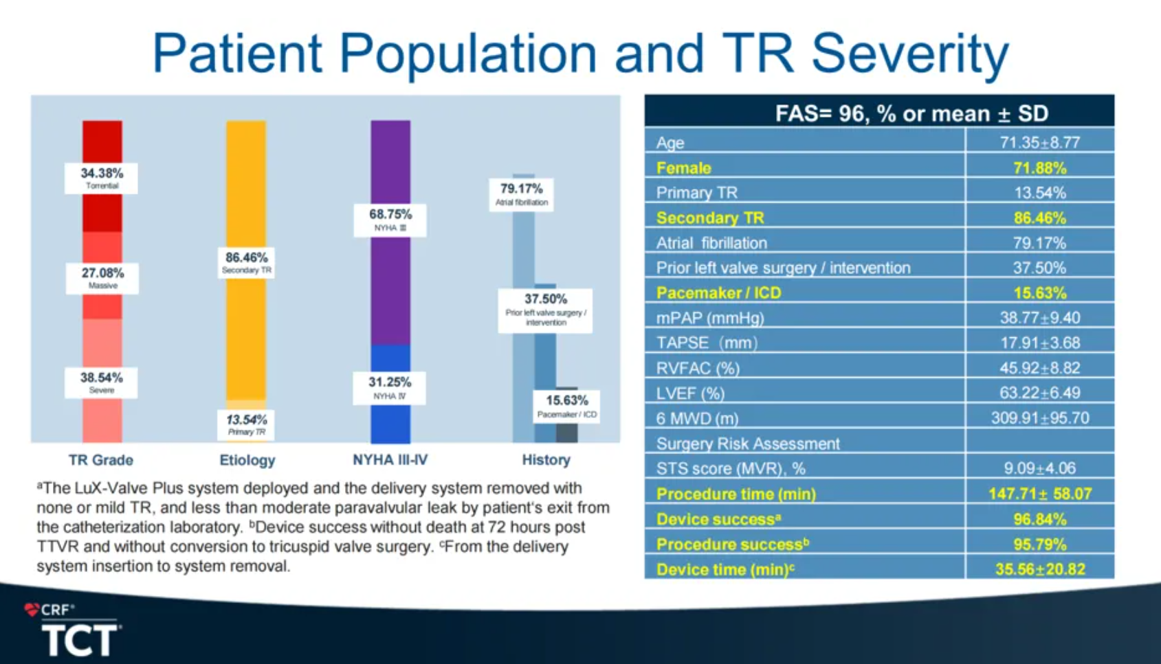TRAVEL II研究主要用于評(píng)估LuX-Valve Plus在重度三尖瓣反流患者中應(yīng)用的長(zhǎng)期安全性和有效性。TRAVEL II臨床試驗(yàn)共納入了中國(guó)15家臨床中心的96例患者。患者平均年齡為71.35歲,平均STS評(píng)分為9.09%,37.50%的患者在研究前接受了左心瓣膜手術(shù),15.63%的患者存在起搏器植入史,同時(shí)多合并其他基礎(chǔ)病,基線情況較差,存在較高的外科手術(shù)風(fēng)險(xiǎn)和接受其他介入治療方式的難度。