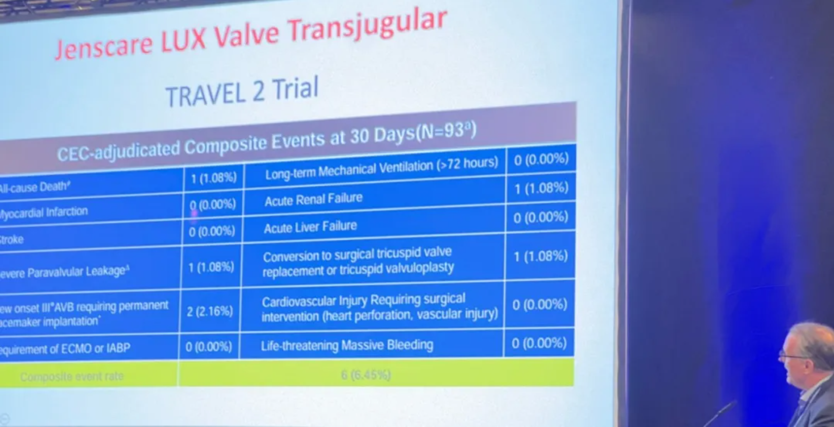 據(jù)這位教授介紹,作為國(guó)際創(chuàng)新的三尖瓣反流介入治療器械,LuX-Valve Plus已在歐洲全面開(kāi)展以獲取CE Mark為目標(biāo)的臨床試驗(yàn)。他欣喜表示,LuX-Valve Plus的安全性及有效性正在逐步得到驗(yàn)證,其30天全因死亡率僅有1.08%(n=93),且由于其非徑向支撐力的設(shè)計(jì),術(shù)后新發(fā)III度房室傳導(dǎo)阻滯概率僅為2.16%。同時(shí),創(chuàng)新的經(jīng)頸靜脈入路展現(xiàn)了其獨(dú)特的優(yōu)勢(shì)。研究結(jié)果表明,術(shù)后30天內(nèi)無(wú)危及生命的大出血事件發(fā)生。